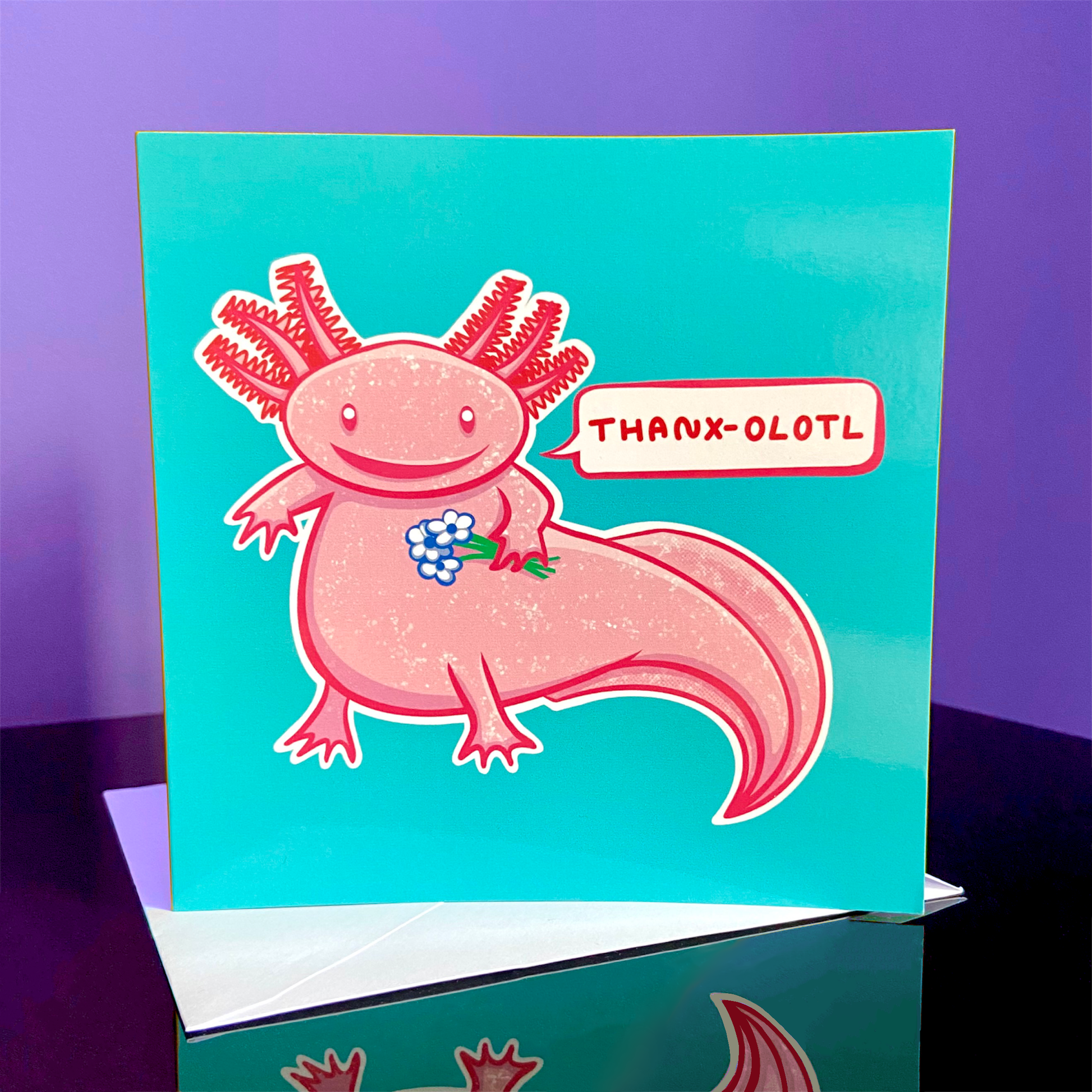 Cute axolotl greetings card with punny sentiment ‘Thanx-olotl’.