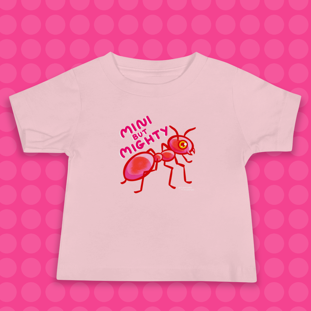 Cute ant design tee with slogan, ‘Mini but Mighty’ for those little ones with big personalities.