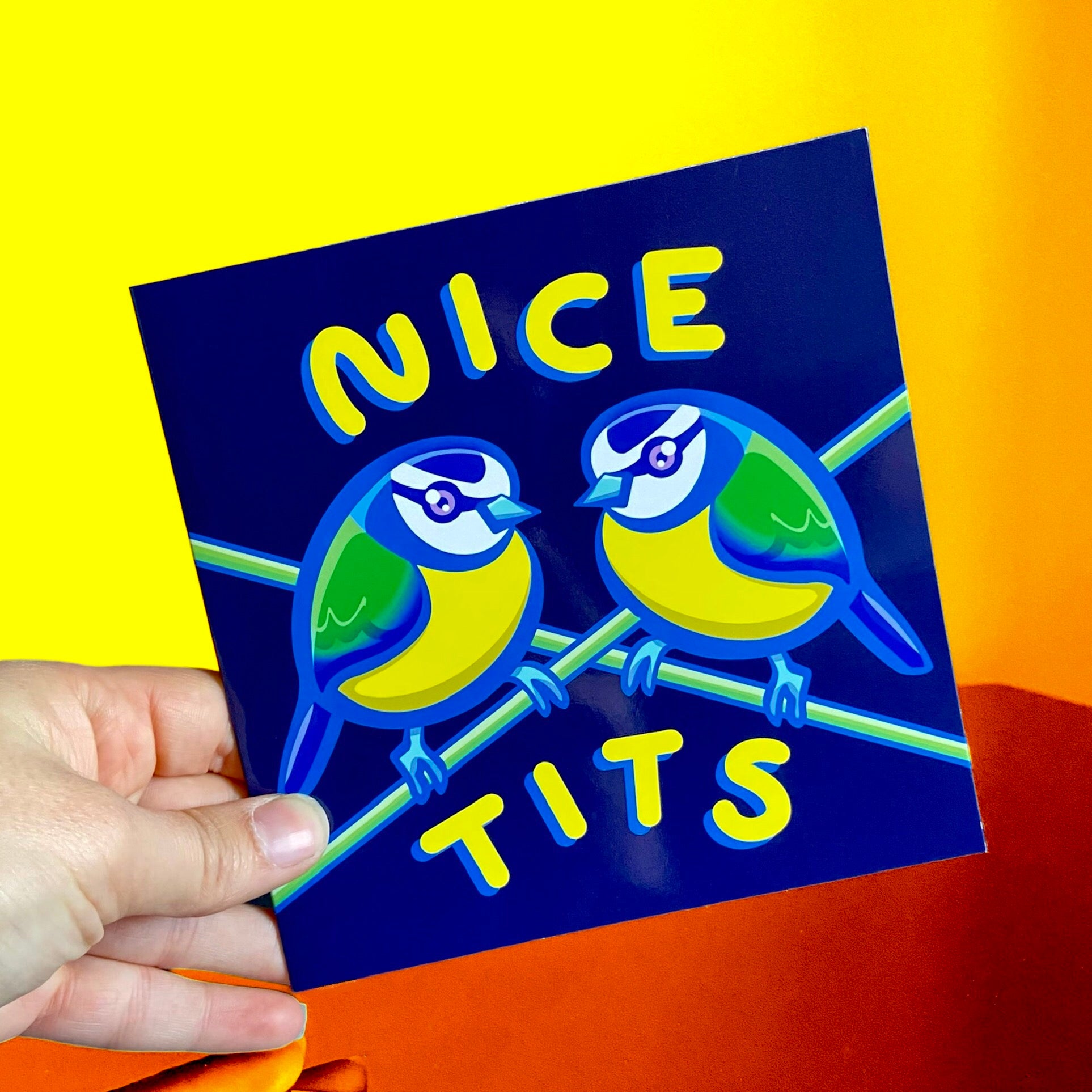 Blue Tit card featuring much loved British garden birds with Rude Pun ‘Nice Tits’.