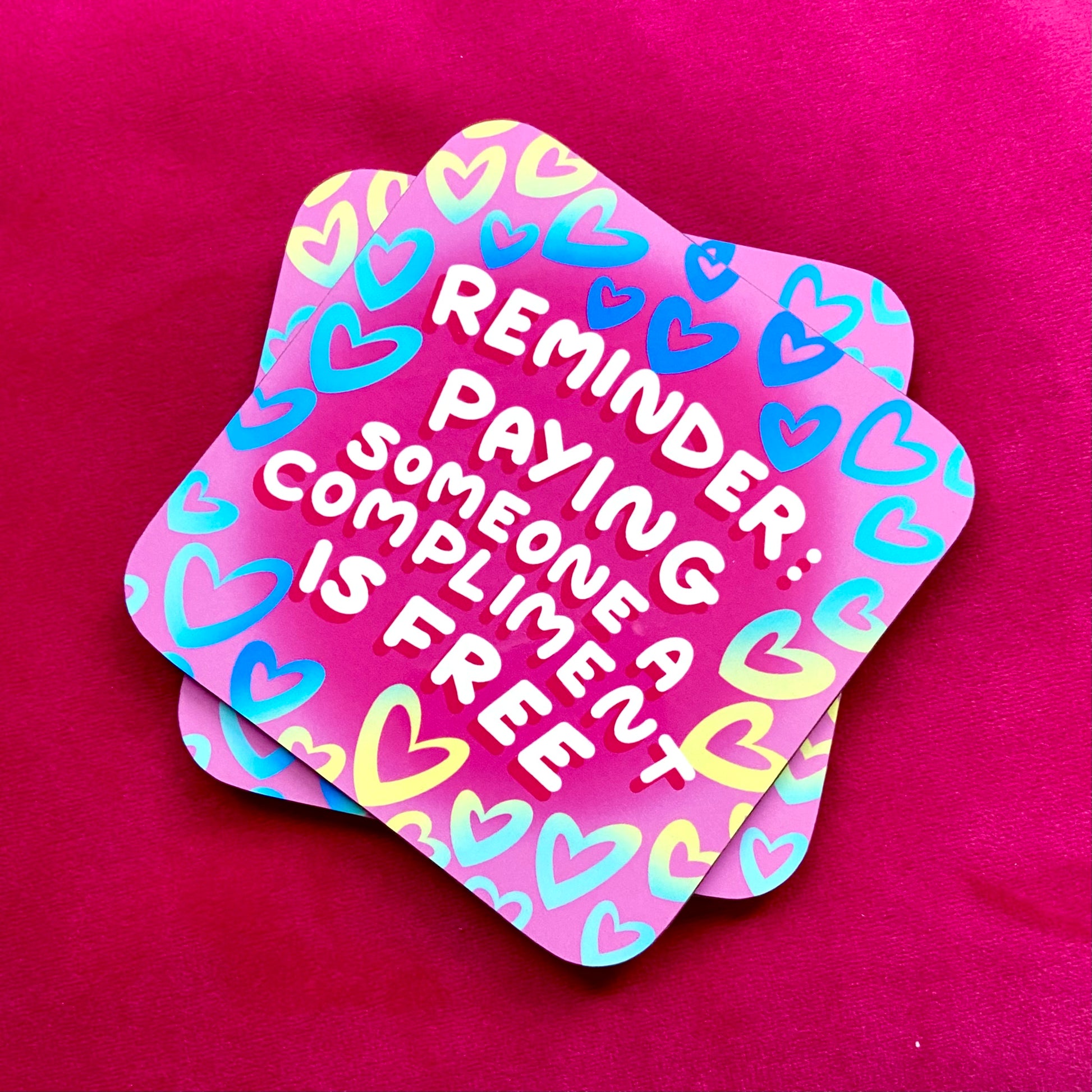 Cute coaster with slogan, ‘Reminder: paying someone a compliment is free’.