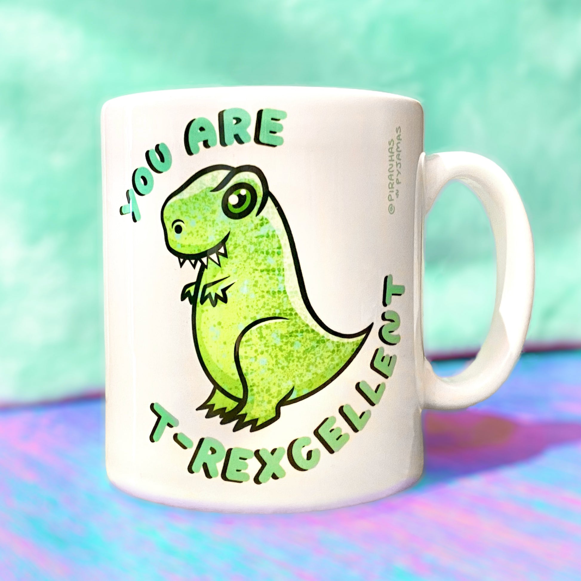 Kawaii dinosaur mug with motivational slogan, ‘You are T-Rexcellent’.