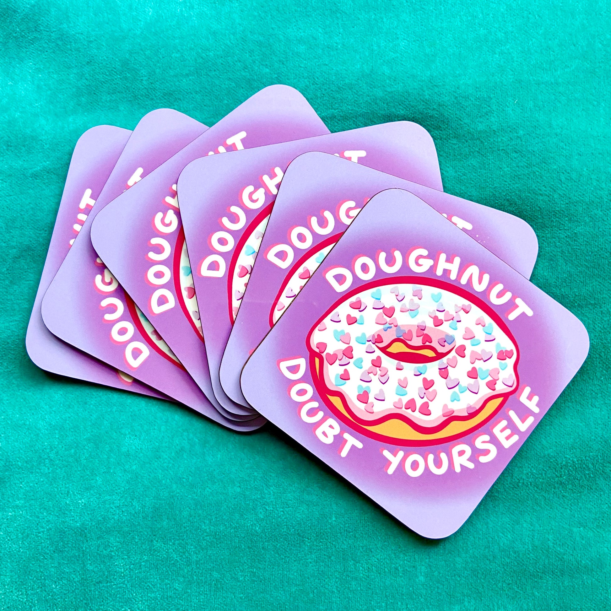 Cute doughnut coaster with positive affirmation, ‘Doughnut Doubt Yourself’.