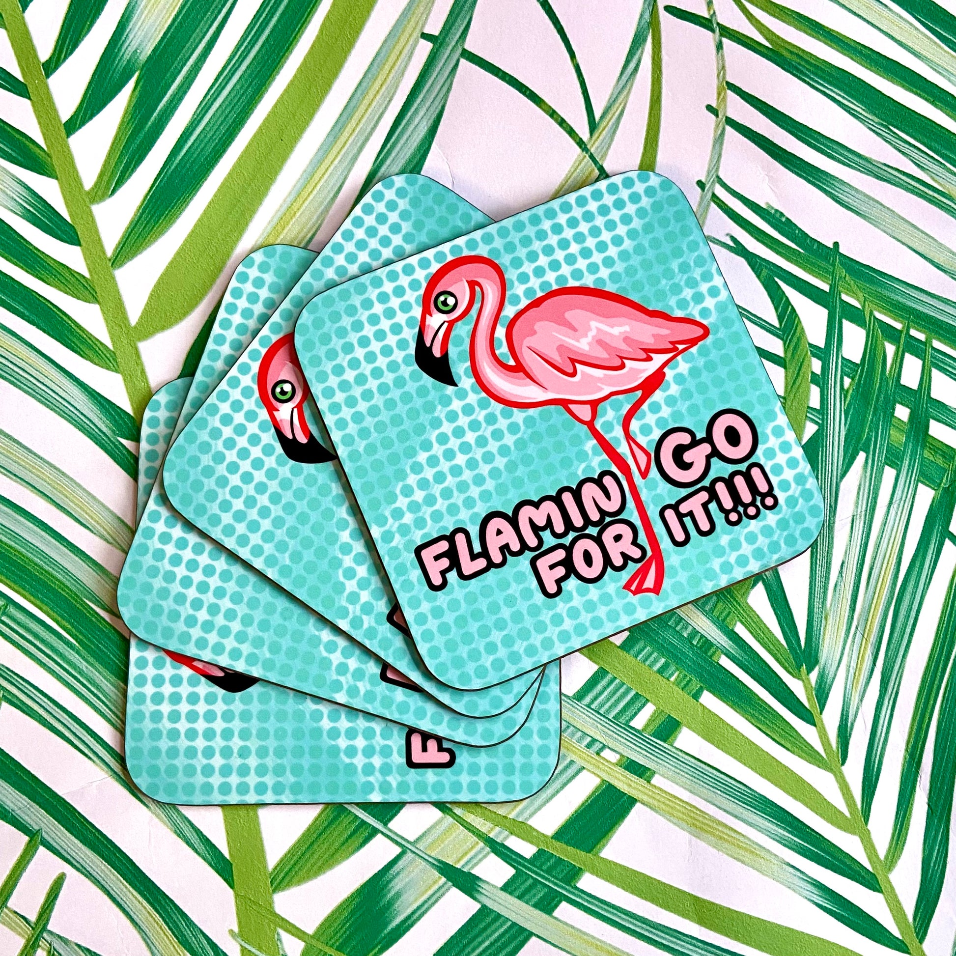 Flamingo coaster with motivational slogan, ‘Flamin-go for it’.