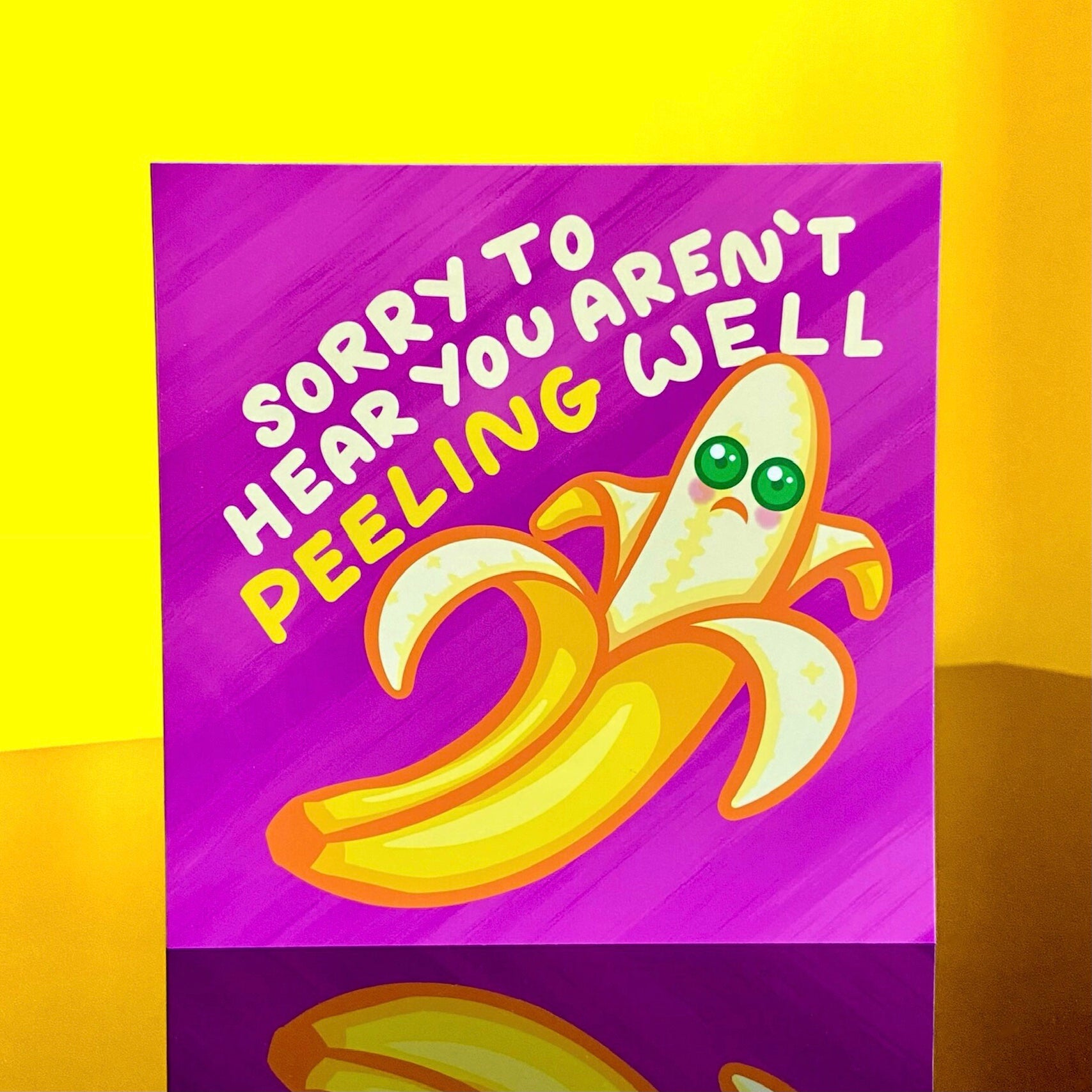 Funny banana card complete with cute pun ‘Sorry to hear you aren’t’ peeling well’.