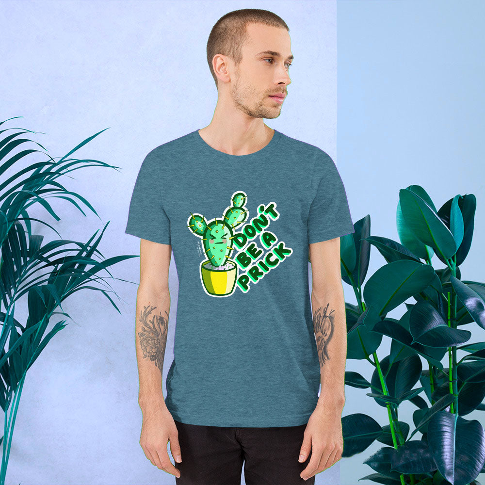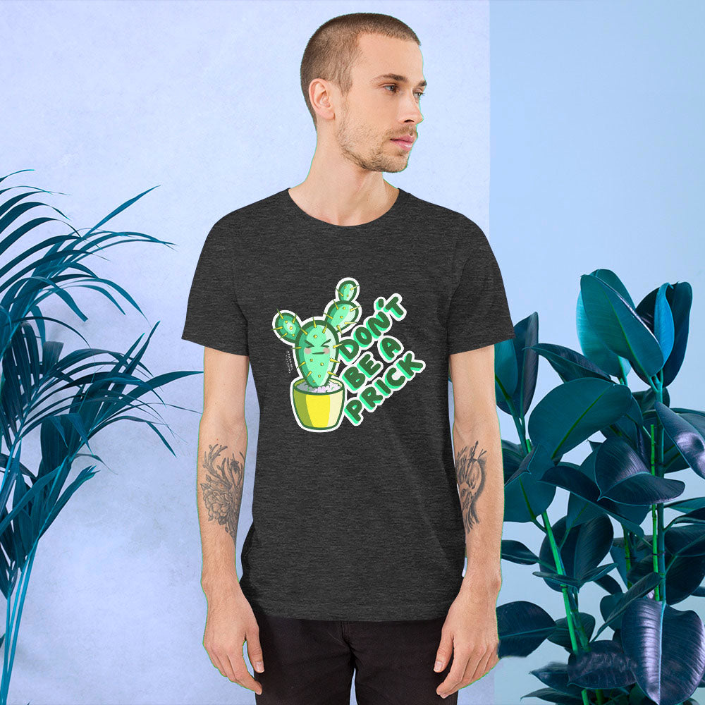 Unisex cactus design tee with cheeky sweary slogan, ‘Don’t be a prick’.