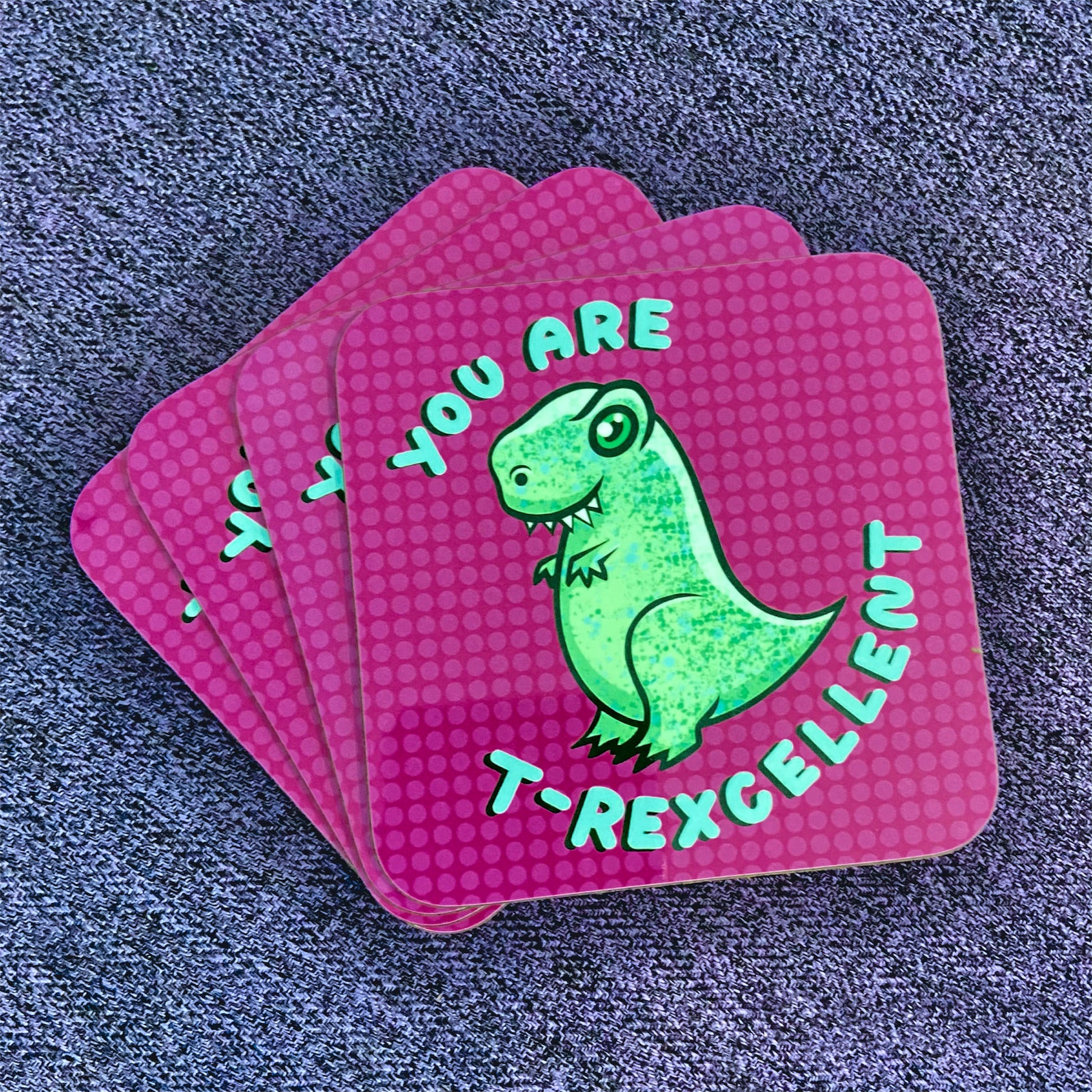 Kawaii dinosaur coaster with motivational slogan, ‘You are T-rexcellent!’