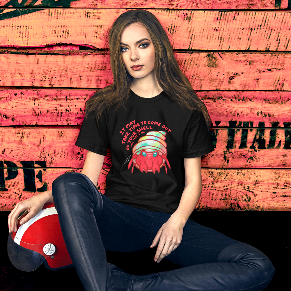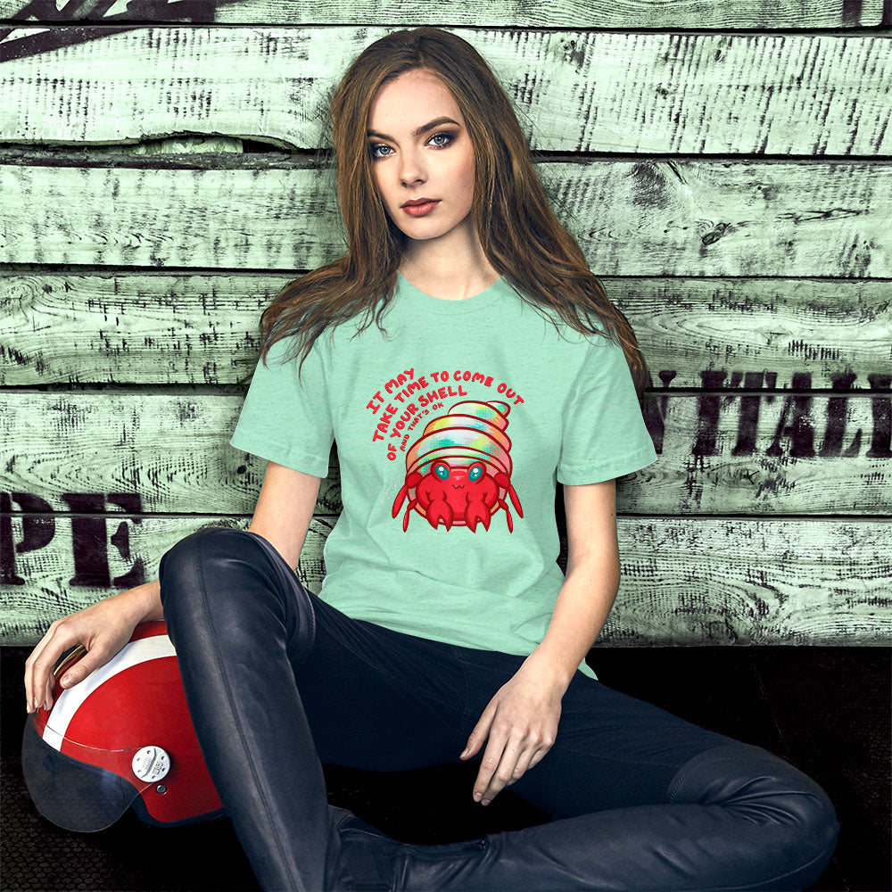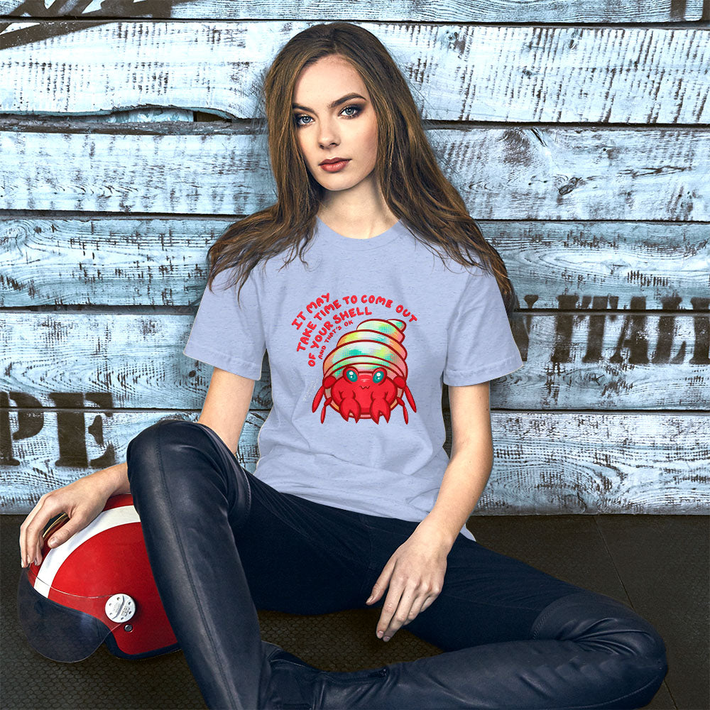 Unisex hermit crab design tee with self care slogan, ‘it may take time to come out of your shell and that’s ok’.