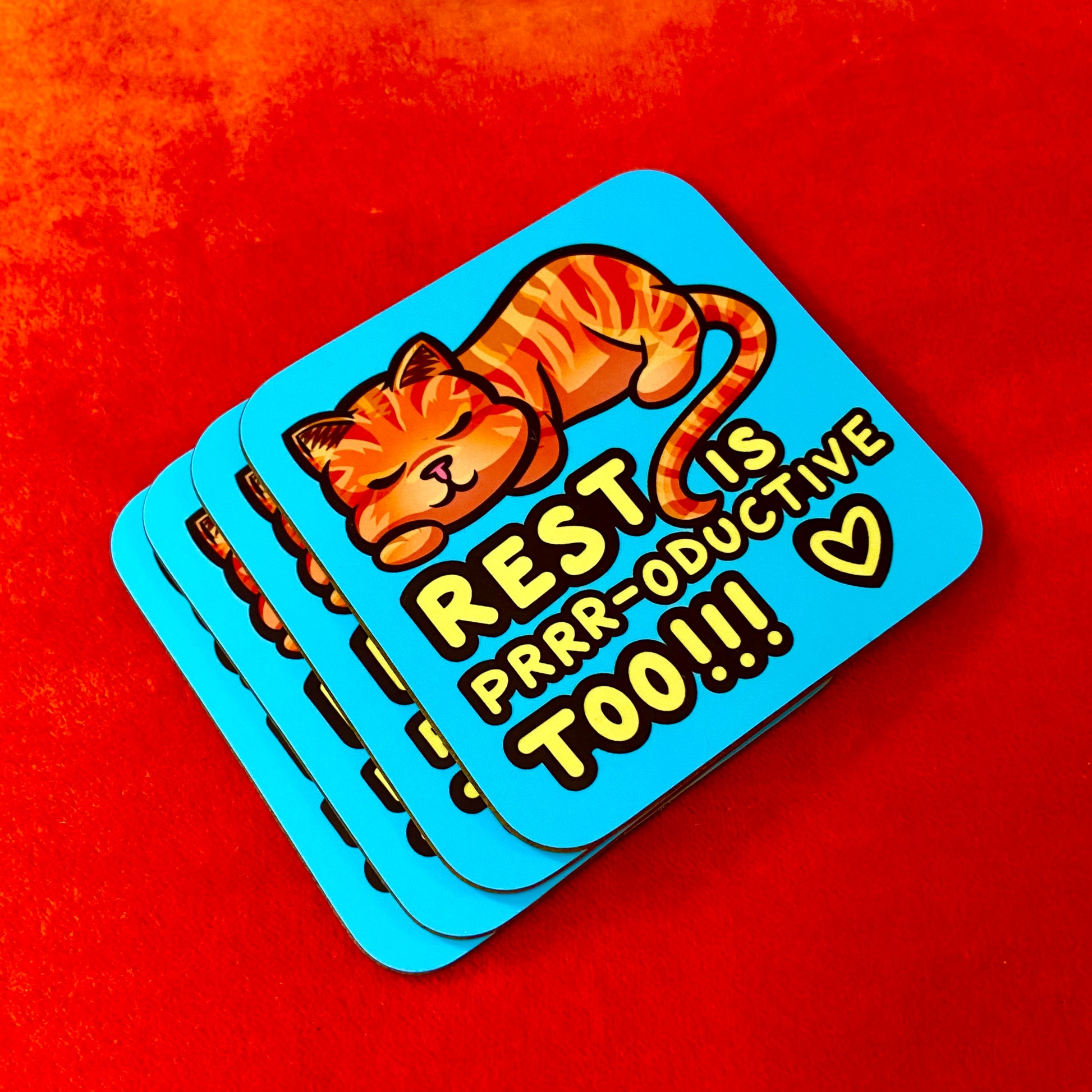 Kawaii kitty coaster with self care slogan, ‘Rest is prrr-oductive too!!!’