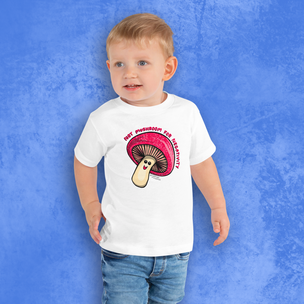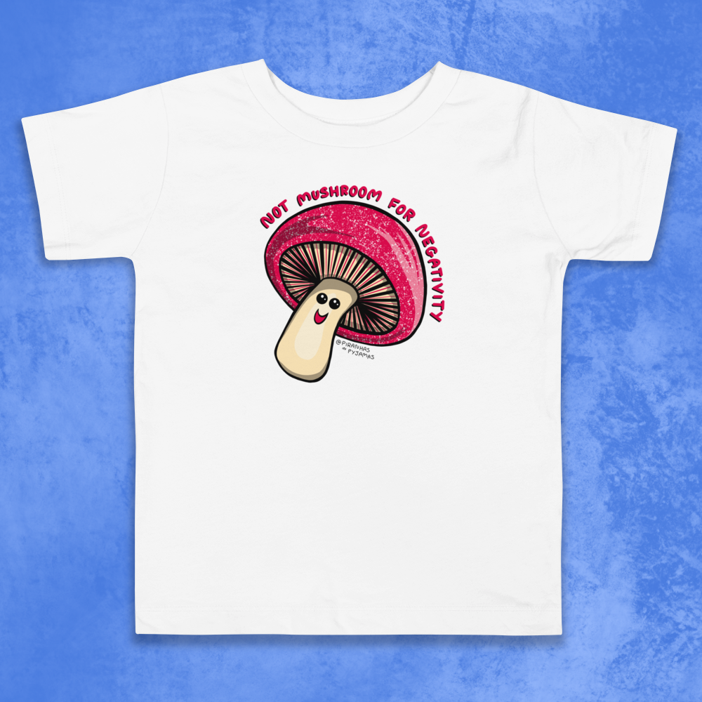 Kawaii mushroom design tee with motivational slogan, ‘not mushroom for negativity’.