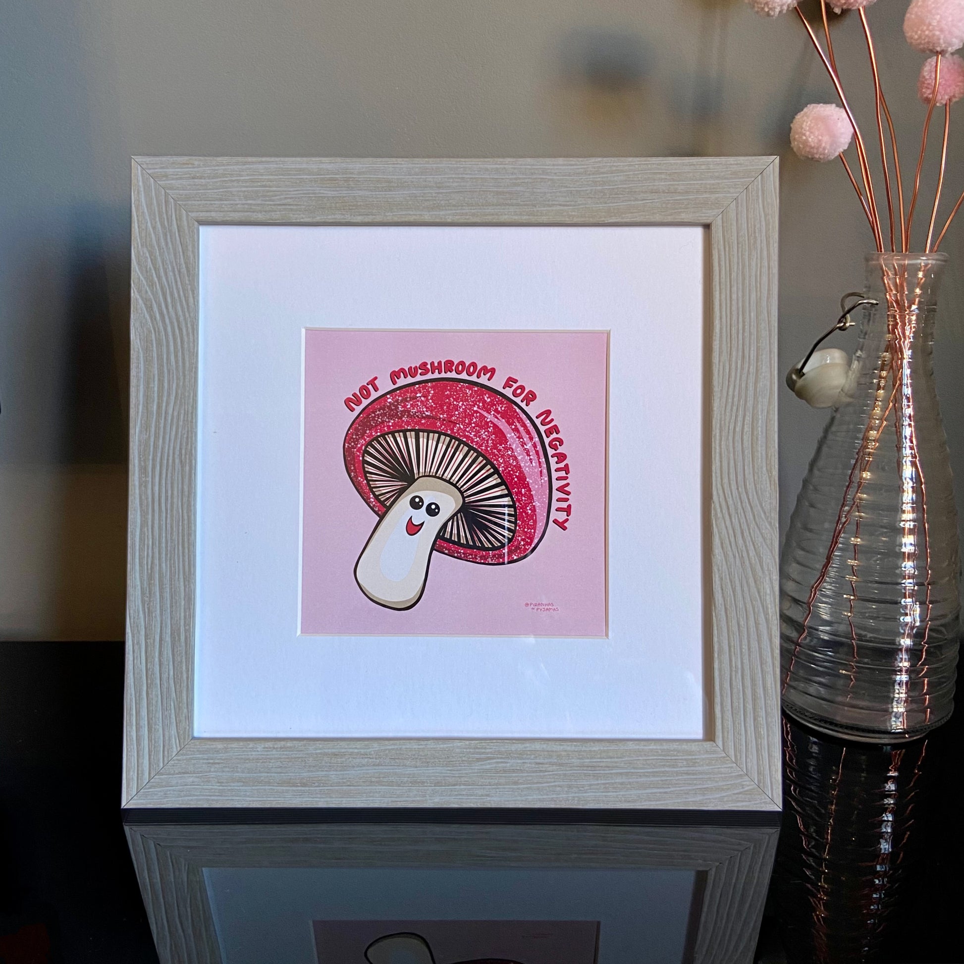 Mounted print with positive slogan: ‘Not mushroom for negativity’.