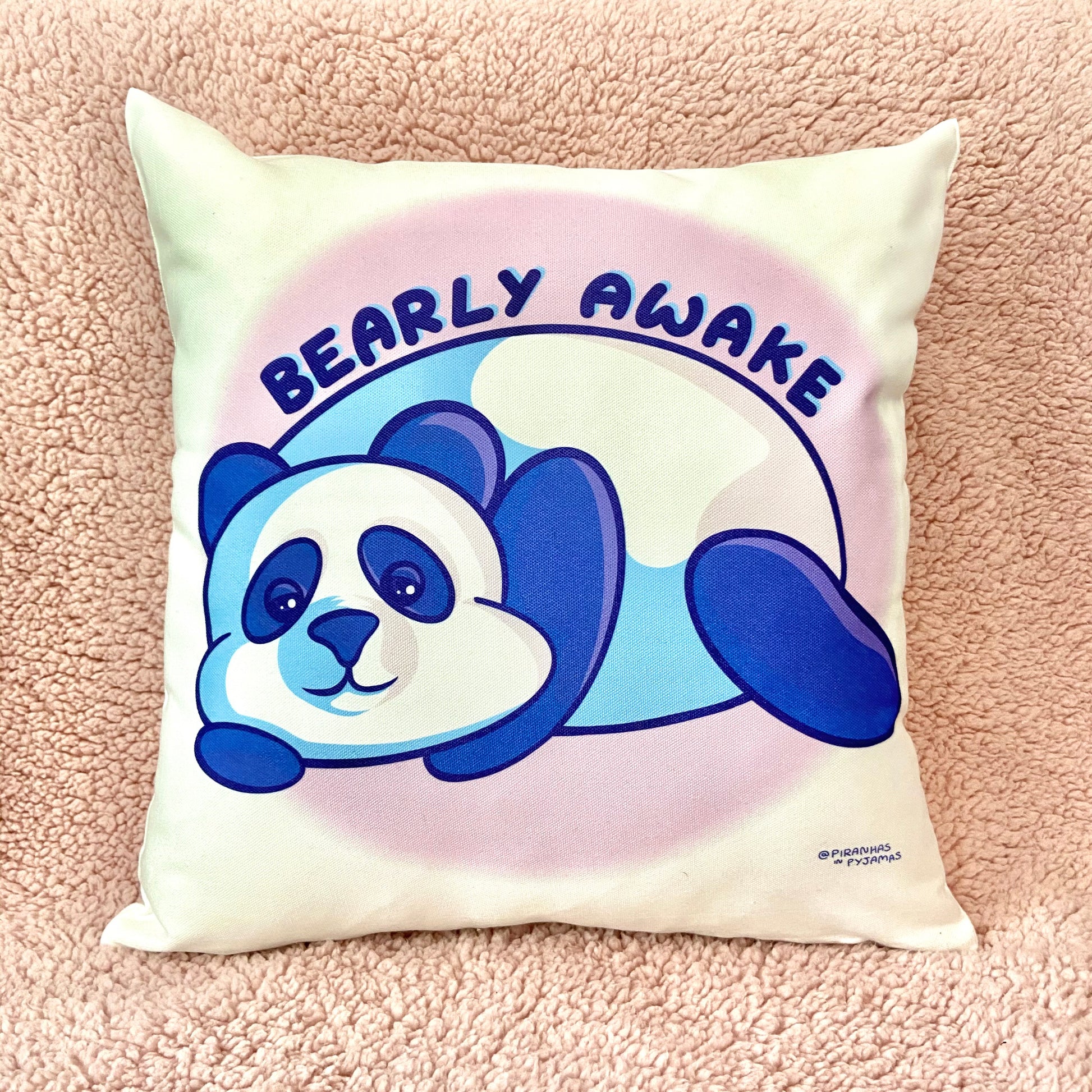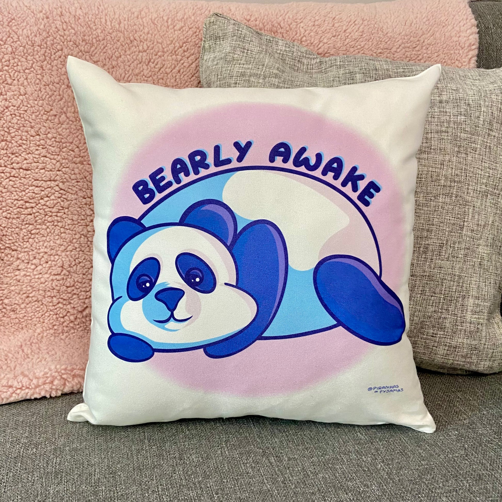 Kawaii panda cushion with cute slogan: ‘Bearly Awake’.