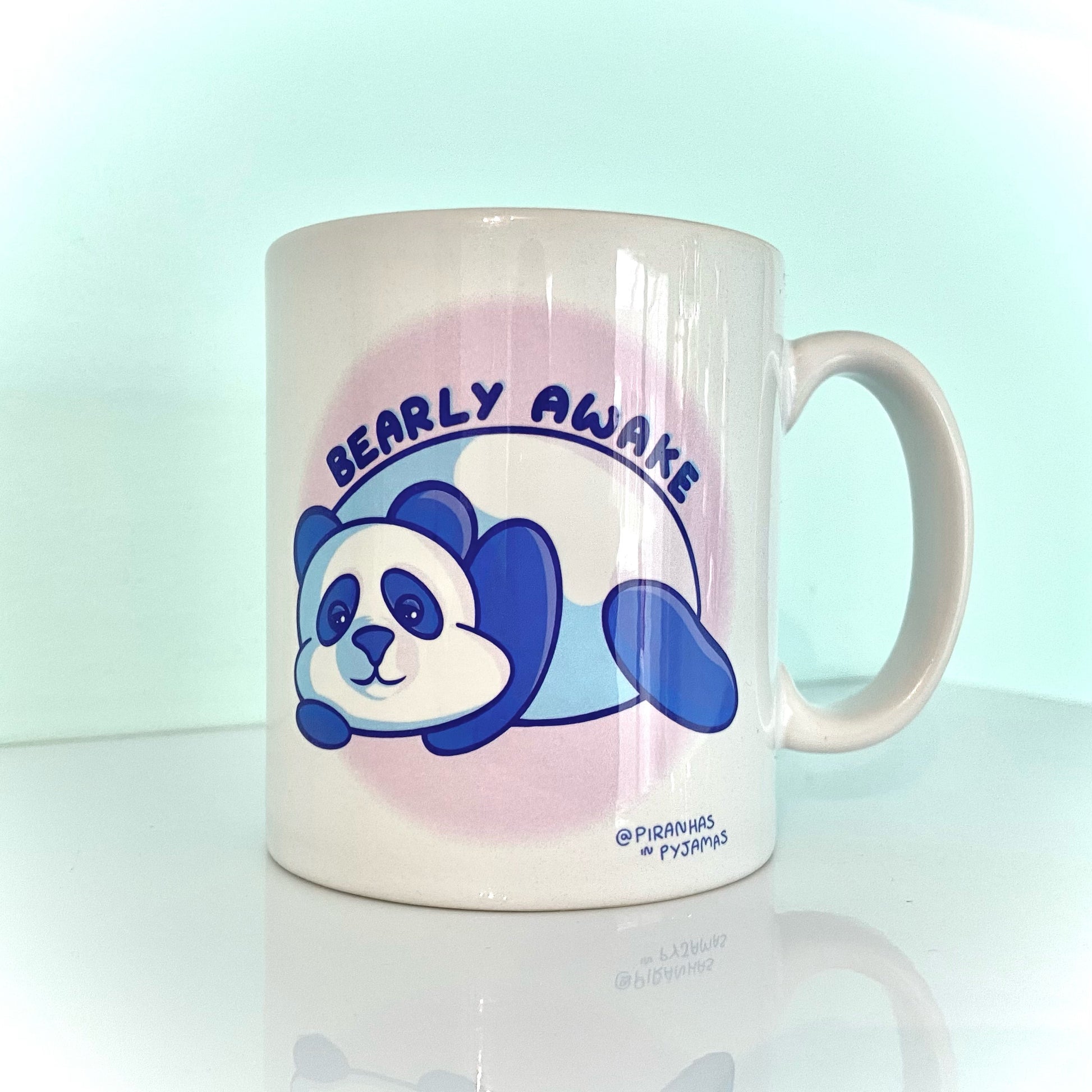 Kawaii Panda mug with cute slogan, ‘Bearly awake’.