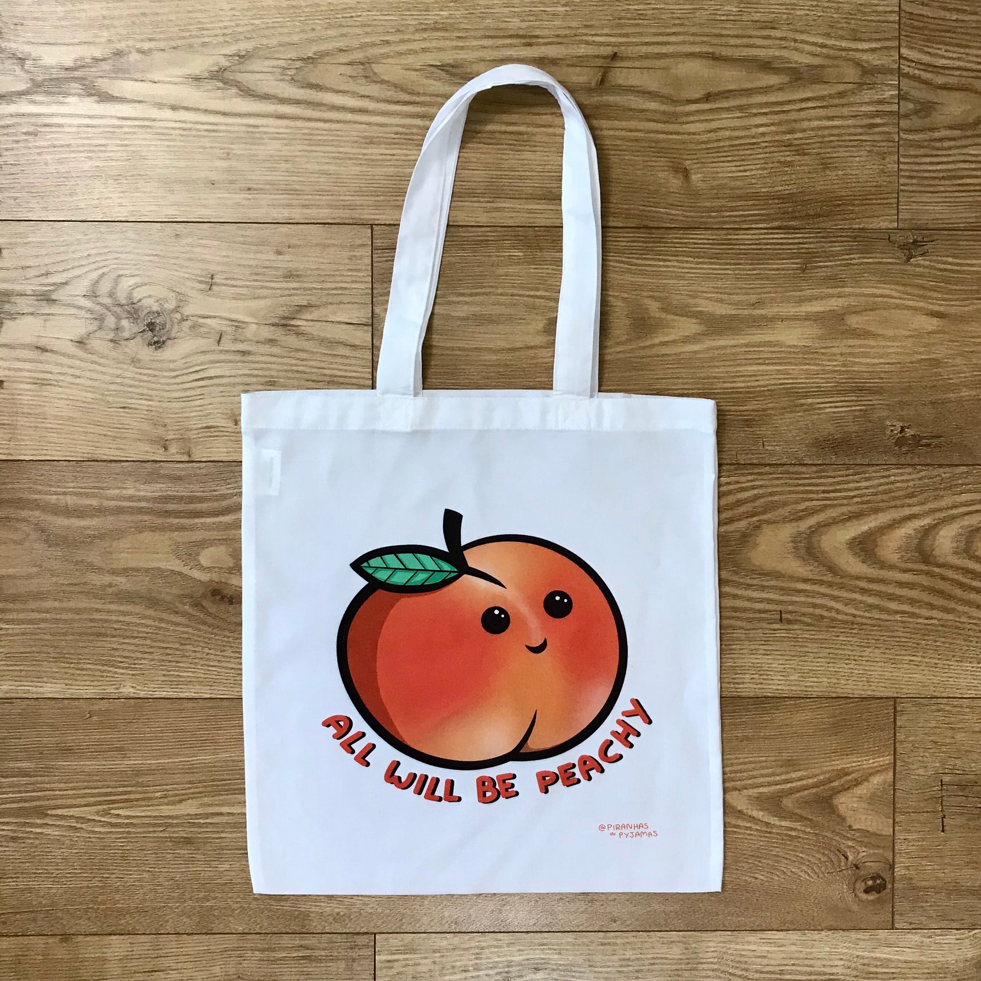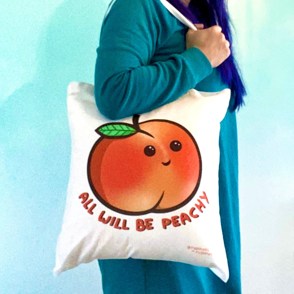 Kawaii style reusable tote bag with peach design and motivational slogan, ‘All Will be peachy’.