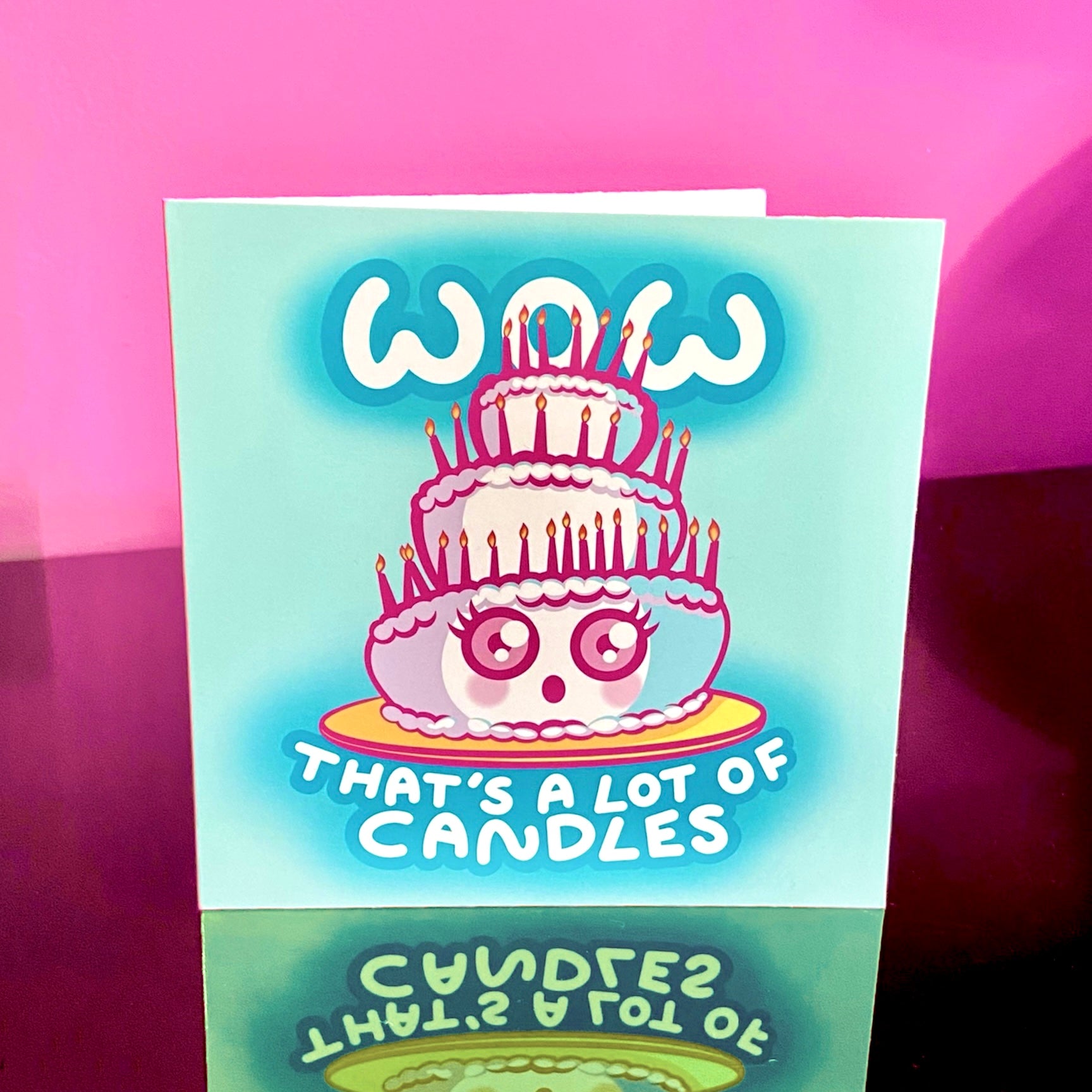 Kawaii cake birthday card with cheeky sentiment ‘Wow, that’s a lot of candles’.