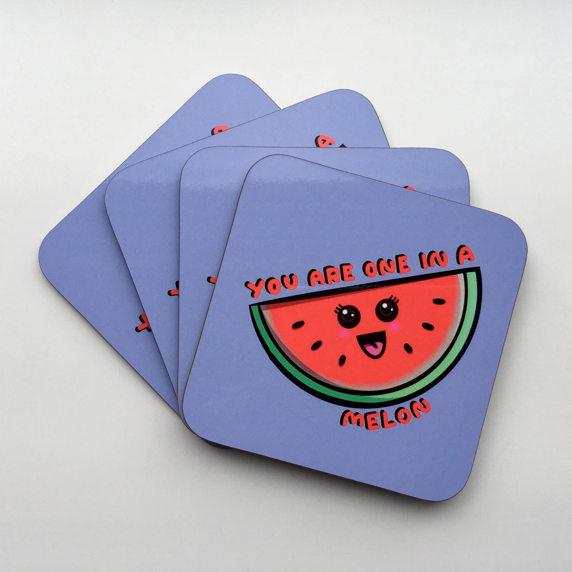Kawaii watermelon coaster with motivational slogan, ‘You Are One In A Melon’.