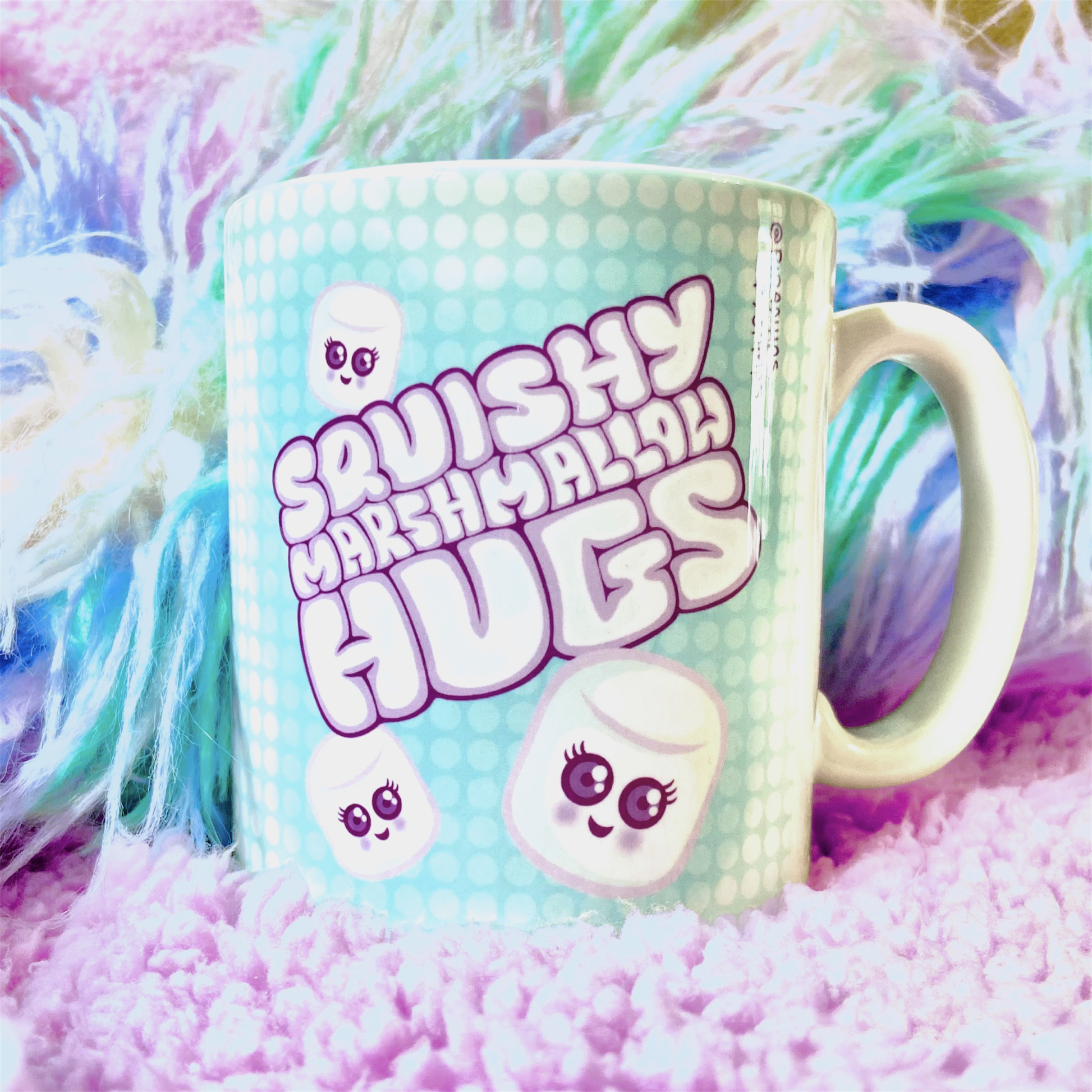 Kawaii marshmallow mug with sweet sentiment: ‘Squishy marshmallow hugs’.