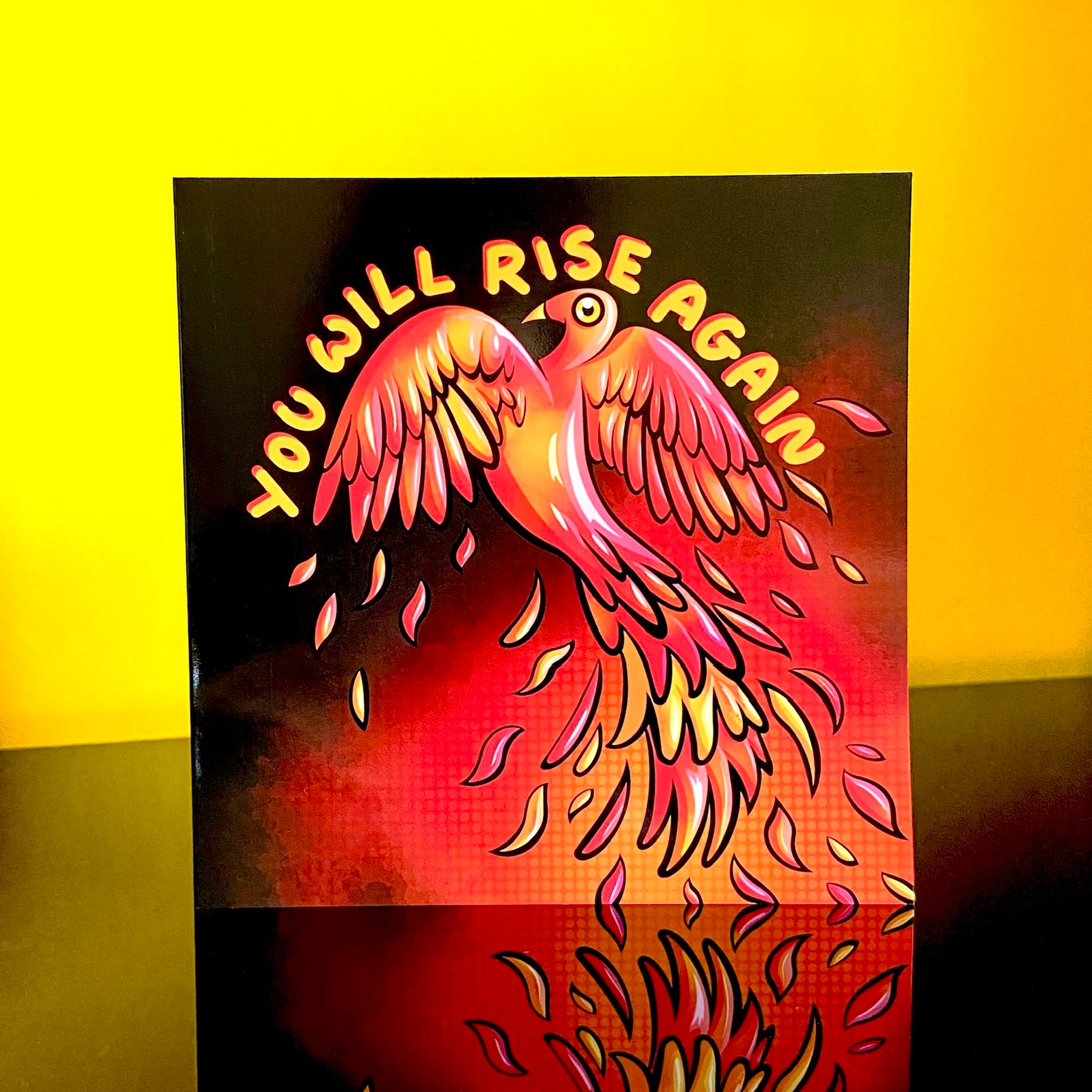 Motivational pheonix greeting card with encouraging words, ‘You will rise again’.