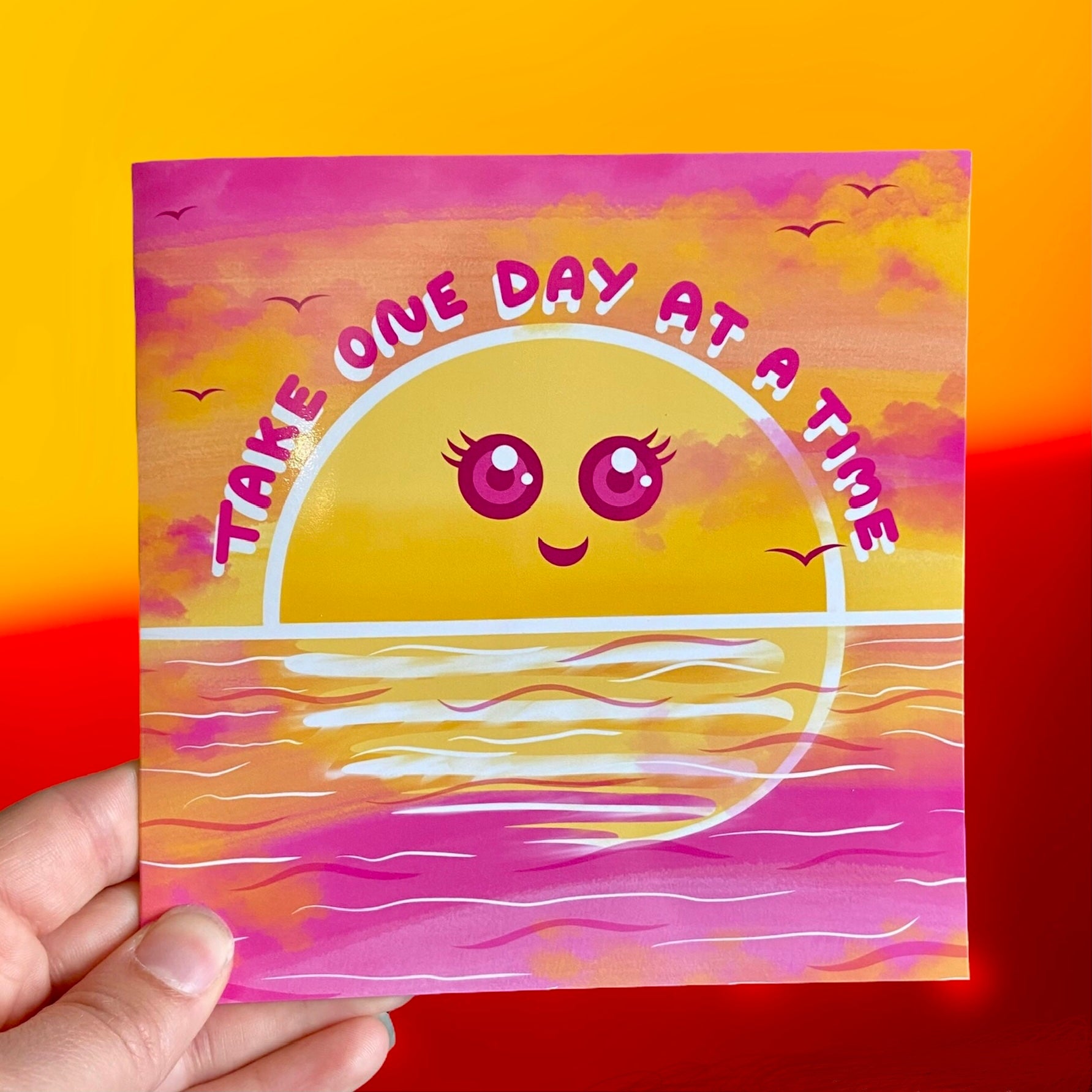 Kawaii Sunset greetings card with self care ‘Take One Day At A Time’.