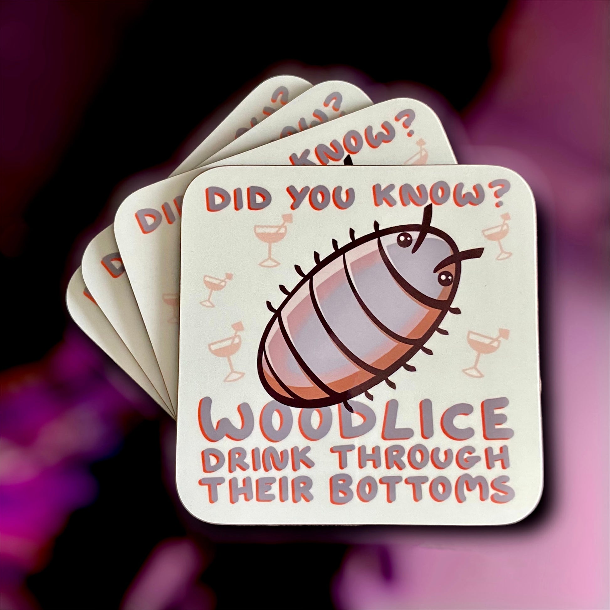 Funny coaster with strange fact, ‘Did You know? Woodlice drink through their bottoms’.