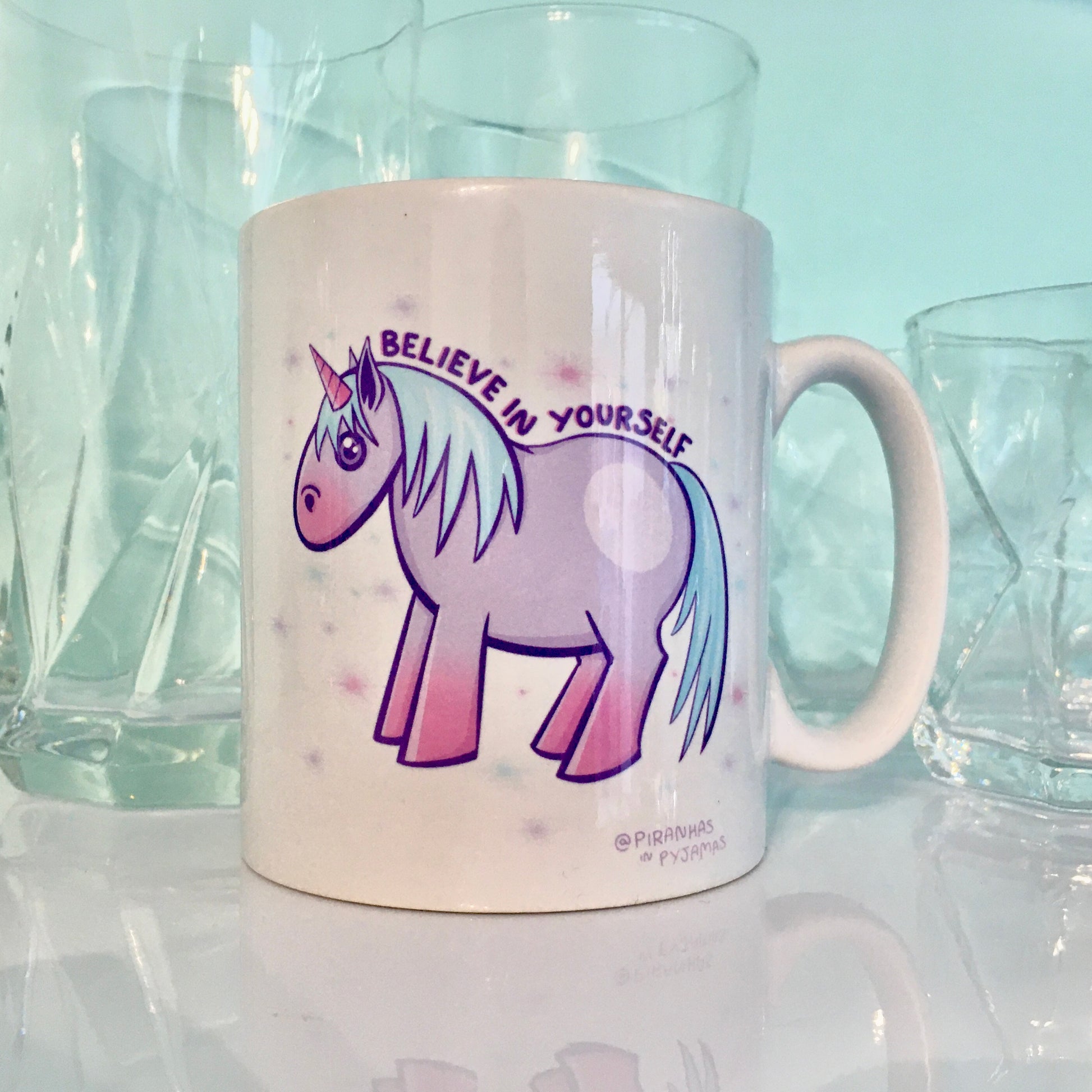 Unicorn mug with motivational slogan, ‘Believe in yourself’